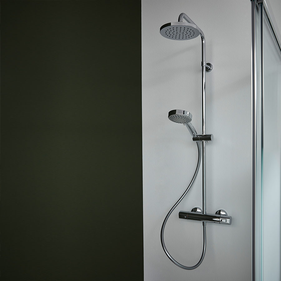 Komfort und Entspannung unter der Dusche: das VIGOUR clivia Duschsystem mit Regendusche, Handbrause und Thermostat zeigt in Kombination mit der extraflachen Duschwanne und der modernen Duschabtrennung, dass Komfort und Design wunderbar Hand in Hand gehen.